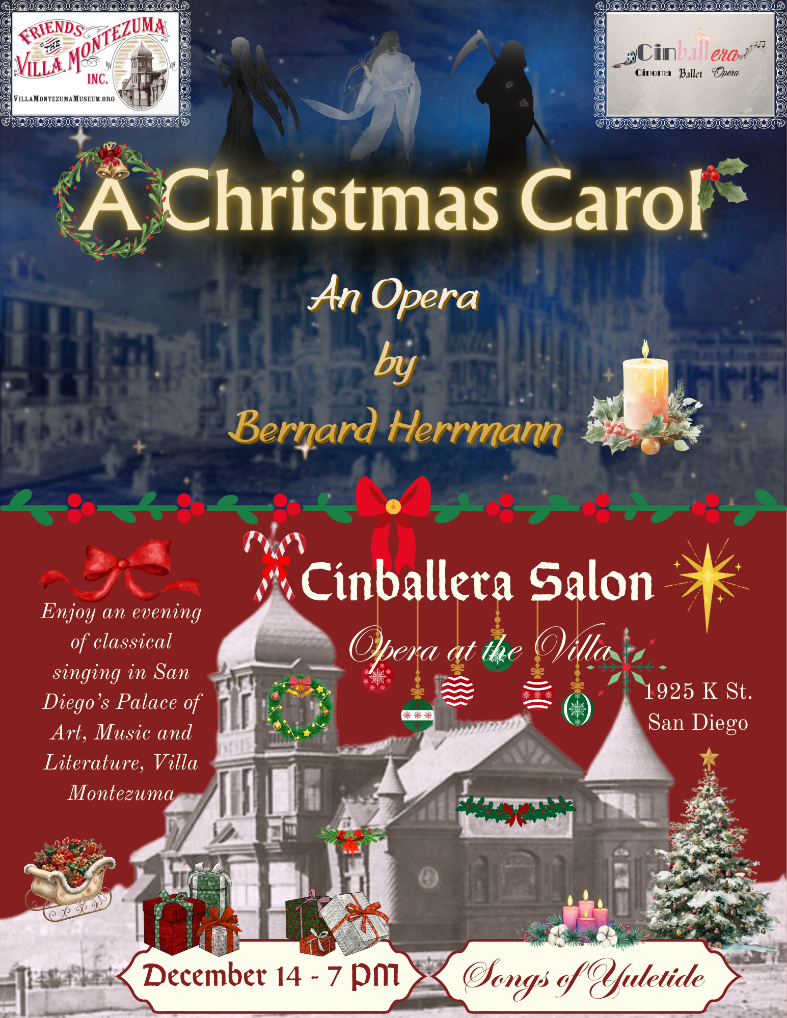Celebrate Christmas at the 10th and final Cinballera Salon of 2026, Songs of Yuletide! Join us on the 2nd Monday of the month, December 14, at 7 PM at the Villa Montezuma, 1925 K Street, San Diego.