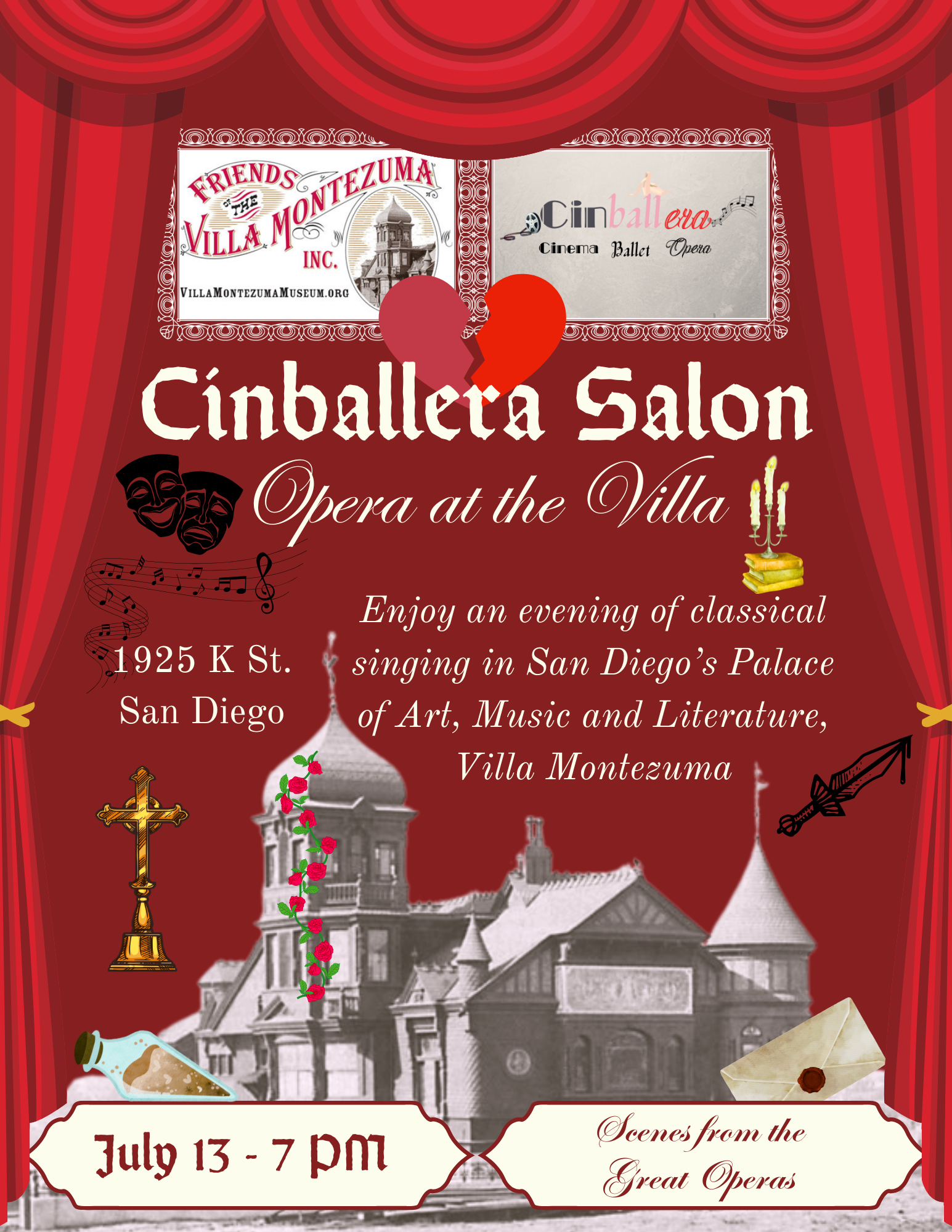 As summer heats up, the drama is even hotter at the 6th Cinballera Salon of 2026, Scenes from the Great Operas! Join us on the 2nd Monday of the month, July 13, at 7 PM at the Villa Montezuma, 1925 K Street, San Diego.